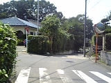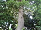 {右}シラカシ ダイエーからの道との交差を過ぎると住宅地になる。すぐに閉鎖された神社がありその脇にシラカシの大木が東海道に面している。横浜市指定銘木・古木。シラカシはブナ科の常緑樹。 |