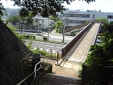品濃橋(歩道橋) 坂を下り始めると車道は右にカーブし環状2号線に接続していくが途中左側の歩道橋につながる階段を降りる。これが旧東海道で橋の手前左には「品濃坂」と書かれた石碑があり旧東海道の地図が描かれた銅板が埋められている。元々ここも品濃坂の一部で対岸の道まで繋がっていたが環状2号線の工事で切り崩され分断された。昭和62年に架けられたこの歩道橋で環状2号線を渡る。 |