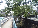 川上川沿いの道 品濃坂を下りきると平坦な道を進む。やがて川上川が右側に平行し住宅地の中の川沿いの道を進む。対岸に桜並木が植えられ春は桜の名所となる。やがて東戸塚駅入口交差点で国道1号線を横断し今度は左に平戸永谷川(柏尾川)を見て川沿いに進む。 |