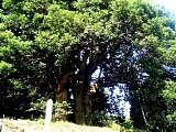 {左}益田家のモチの木 大山道分岐のすぐ先の向かいにある。昭和56年に県指定天然記念物になり昭和59年には「かながわの名木100選」にも選ばれている樹齢約300年の巨木。3本にも見えるが2本で両方とも雌株。奥の方が大きく樹高19m目通り(目の高さの回り)3.2m根回り4.9m、手前は樹高18m目通り2.4m根回り3.1m。常緑樹のモチの木は通常高さ3〜8mで樹皮から「鳥もち」を作る。 |