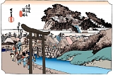 遊行寺橋 広小路の案内板のあるT字路を左折していくと境川に出て赤い欄干と擬宝珠の遊行寺橋を渡る。江戸時代は大鋸橋(おおぎりばし)喜久奈橋 (きくなばし)と呼び天保年間の記録で長さ12間半(22.7m)の板橋だった。境川もこの頃は音なし川と呼んでいた。橋を渡った右手には高札場が左手には江ノ島弁財天の一番目の大鳥居と江の島道道標があり江の島道の起点となっていた。広重の藤沢宿の絵に描かれている場所で橋を渡って遊行寺側に向かって描いている。 |