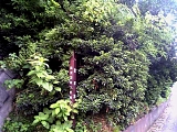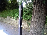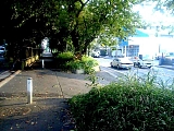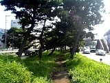 戸塚松並木 大坂上の信号で左に分岐しさらに上っていくと国道1号バイパスと合流する。上りと下りの間の中央分離帯が樹木帯となっている。現在は松は少ないが江戸時代には戸塚並木という松並木だった。3代将軍家光の時代に日照りが続いたので歩行者のために街道に松が整備されていったのが始まりで江戸中期や末期には鬱蒼とした山林に成長し浮世絵などにも描かれている。少し行くと中央分離帯の中に50mほどの松並木に挟まれた小道がある。小さな案内板もあるが錆びていて読めない。 |