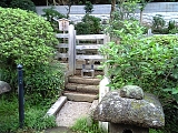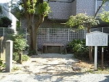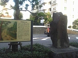 {左}原宿一里塚(11) 原宿2-31-2 さらに行くと原宿第一歩道橋過ぎから下り坂となる。途中「寿々喜園一里山」という看板が出ている植木屋の敷地に案内板がある。塚の付近に茶店があったのでこのあたりが原宿と呼ばれるようになった。明治9年(1876)里程標の杭を建てる際に一里塚は取り払われた。 |