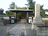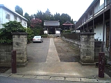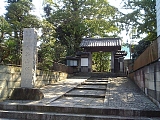 {右・寄}遊行寺総門 板割浅太郎の墓 広小路の案内板のあるT字路を右折すると正面にある。総門とは禅寺の表門のこと。日本三大黒門の一つに数えられる冠木門(かぶきもん)で冠木とは柱の頂上より少し下に横木がある門をいう。門をくぐってすぐ左手の墓地の突当りに「貞松院住職列成和尚」の墓があり横に「板割浅太郎の墓」の案内板がある。浅太郎は国定忠治の子分で後に僧となって遊行寺の塔頭の貞松院住職となり明治13年(1880)遊行寺火災後の再建に奔走した。門の先は「いろは坂」と呼ばれる四十八段のゆるやかな石段が本堂前の広場まで続き途中には塔頭の真浄院、真徳寺がある。 |