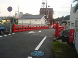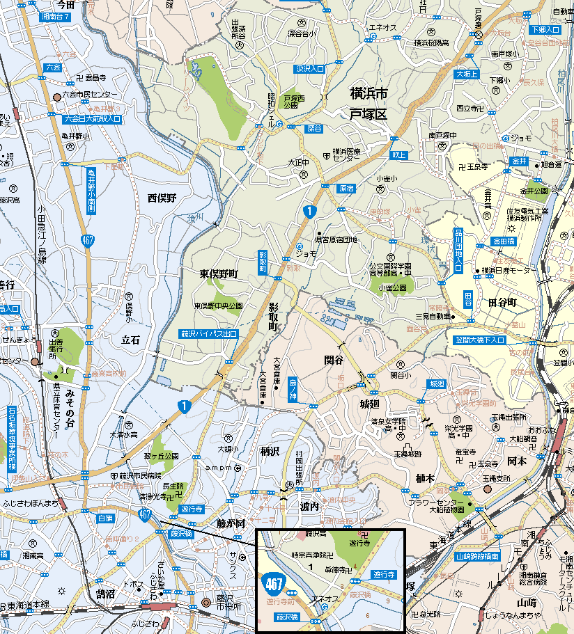 {左}藤沢橋自動車排出ガス測定局 遊行寺橋を渡った交差点の左にある。旧東海道に面しているため景観を考慮して作られた江戸時代風の建物。交通の要所として自動車の排出ガスの主成分窒素酸化物や浮遊粒子状物質などの測定を行っている。建物の前にある立看板には「東海道藤沢宿昔話のある町 仲久保町、藤籠町」とある。下流すぐに架かっている藤沢橋は関東大震災以降になって初めて架けられたもの。東海道はこの交差点を右折し国道467号に合流する。 |