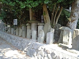 {右・寄}白旗神社 石塔群 白旗神社の本殿に向かう石段下左にある。寛文5年(1665)を中心とした庚申塔は他にも享保、文政、天保(1830-1844)まで幅広い年代のものが見られる。一番奥には馬頭観音がある。手前には江の島道標もある。江ノ島弁財天を信仰していた杉山検校(1610-1694)が元禄2年(1689)頃に建てたとされる48基の道標の一つで「一切衆生」「二世安楽」「ゑのしま道」と刻まれている。48基のうち10基が現存しており他に藤沢橋から藤沢駅に向かって100mほど行ったY字路や藤沢市役所、江ノ島弁財天社殿前などにも置かれている。杉山検校は本名杉山和一と言い鍼医で綱吉の侍医でもあった。 |