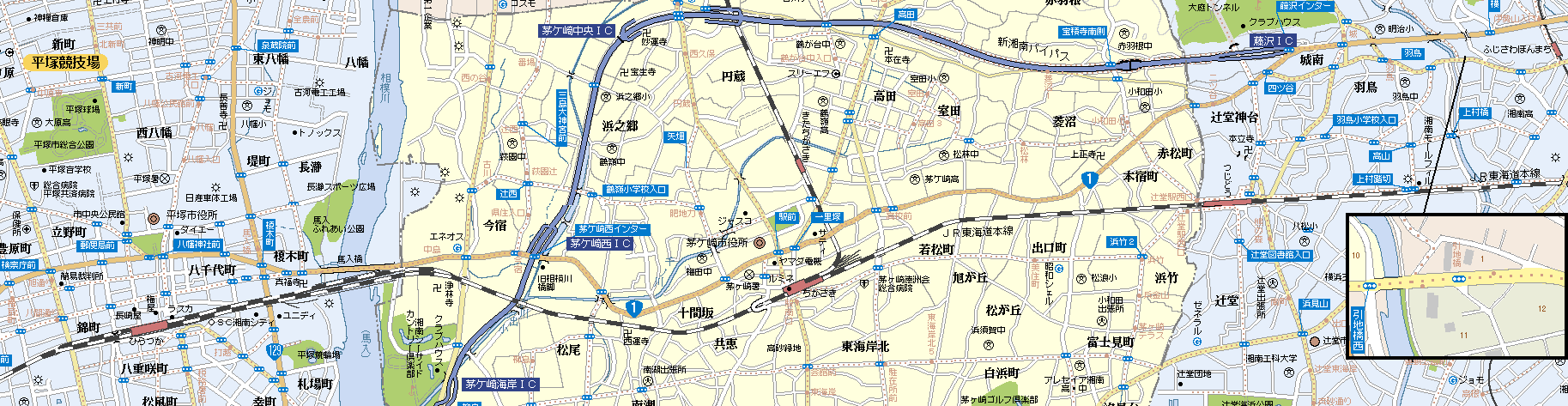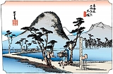 平塚宿 本陣1脇本陣1旅籠54家数443人口2114[天保14年(1843)] 小田原北条氏の築城で発展した町で相模川を利用した物資の集散地として栄えていたが宿場としては次の大磯宿まで27町(3km)と東海道宿場間では2番目に短く小規模の宿場だった。素通りして大磯宿まで行こうとする旅人をなんとか泊まらせようと留女が客引を盛んに行い高麗山を指して「あの山頂を越えぬと大磯には行けぬ」と嘘をついて強引に泊めたという話もある。規模が小さい上に参勤交代による通行量増大で伝馬負担が重くなり困窮したため慶安4年(1651)には平塚八幡宮の門前集落も新宿として加宿された。宿場模型や資料が平塚市博物館(浅間町12-41)に展示されている。 |