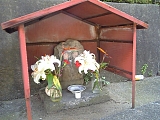 {左}おしゃれ地蔵 養命寺少し先の向かいに祠がある。双体道祖神で女性の願い事は何でも叶えられるとされ御礼に白粉を塗るのが風習となり、おしゃれ地蔵、化粧地蔵という名前が付いた。 |