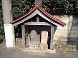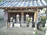 {右・寄}車地蔵&佐々木卯之助供養碑 海前寺の門前から左に行き寺の敷地が途切れる角にある。祠の中に5体並んでいる地蔵のうちの1体が車地蔵であるとされ、裏切られた恋人の家に放火し捕らえられた村娘が処刑されたのち車を引くような「ギー、ギー」という音が夜中に響くようになったため地蔵を建て供養したところ音がなくなったと伝えられる。その右横の供養碑はもとは青ヶ島にあった佐々木卯之助の墓標。幕府が享保13年(1728)相模川河口から藤沢片瀬海岸一帯に創設した砲術訓練所の大筒役(責任者)になった佐々木は貧しい農民の敷地内での耕作を黙認し天保6年(1836)流罪となり明治9年(1876)青ヶ島で死去した。鉄砲通り(東海岸北5-15-20付近)には明治31年(1898)農民たちが建立した記念碑もある。 |