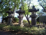 {右}石灯籠3基 茅ヶ崎1-1-1(茅ヶ崎市役所敷地内) 茅ヶ崎駅前交差点地下道の茅ヶ崎市役所側出口を出てすぐの緑地内に石灯籠が3基ある。中央のものは延宝9年(1681)4代将軍家綱の供養に黒羽藩主大関増栄が奉献したもの。両側は天明6年(1786)10代将軍家治供養に長府藩主毛利匡芳(右)と臼杵藩主稲葉弘通(左)が奉献した。江戸時代に将軍の供養のため諸国の大名が徳川家の菩提寺に奉献した灯籠は寛永寺に数百基、増上寺に約千基あったが震災、戦災等でほとんどが崩壊し残ったものは戦後復興の援助者や近隣の寺院に配布された。この3基は大八木家が寛永寺から譲られた10基の内の3基で他にも大八木家や上正寺、小和田公民館(美住町6-20)にも置かれている。増上寺のものは市内には海前寺や龍前院(浜之郷356)にある。 |