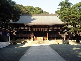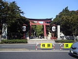 {右・寄}平塚八幡宮 鳥居 平塚駅前交差点を右折し宮の前交差点を渡った左側にある。赤い大鳥居は昭和49年建立で内側には大正11年(1922)の石製狛犬がある。隣の車祈祷場にも赤鳥居がある。社殿前の青銅の鳥居は明和2年(1765)本誉還真上人の寄進で東海道沿いに建てられたもので万延元年(1860)に再建された。その内側の青銅の狛犬は昭和6年(1931)作で戦争に供出したものを昭和46年(1971)に高岡市で鋳造し再建した。神社の敷地一帯は昭和31年開設された八幡山公園になっており広場や平和の慰霊塔、戦災復興事業完成記念碑がある。かながわの美林50選や平塚八景の一つにも選ばれている。 |