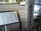 {右}脇本陣跡 しばらく行くと茅沼酒店の前に石柱と説明板がある。脇本陣は享和年間(1801-03)の記録では西組問屋場の先にあったが天保年間(1830-44)にはこの地になっていて山本安兵衛が建坪73坪の規模で営んでいたとの記録がある。平塚市博物館(浅間町12-41)には山本脇本陣の間取り図面が展示されている。平塚市は戦時中は第二海軍航空廠、第二海軍火薬廠、横須賀海軍工廠平塚分工場、日本国際航空工業など軍需工場が集中した都市だったため昭和20年7月16日B29爆撃機132機による大空襲を受け市域の60%近くが焼失した。そのため宿場の建物は何も残ってないが昭和40年建立の加藤一太郎市長(当時)揮毫の石柱と平成13年旧東海道400周年を機に設置された説明板が整備されている。 |