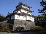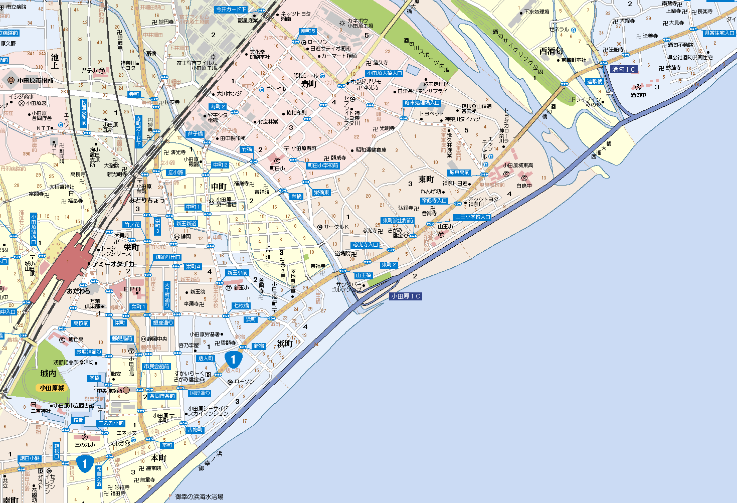 {右・寄}小田原城趾・天守閣 土肥一族の小早川氏が現在の小田原高校辺りに館を築き応永23年(1416)大森頼明が、明応4年(1495)北条早雲が奪った。北条5代のうちに拡張が続き天正18年(1590)秀吉の攻撃で落城し家康の支配下になり江戸時代を迎え大久保氏、阿部氏、稲葉氏そして再び大久保氏を城主とした。寛永10年(1633)と元禄16年(1703)の大地震で大破したが再建。明治3年(1870)廃城となり天守閣など主な建物は解体された。昭和35年築の現在の本瓦葺き3重4階鉄筋コンクリート造の天守閣内は最上階に展望室と下階に美術品や武具を展示し一般400円。近くにある城の歴史を映像で紹介する小田原城歴史見聞館との共通券は600円。両方とも9時-17時、年末年始休館。 |