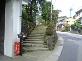 {右}猿滑坂(さるすべりざか)標石 分岐から旧東海道を行くと石畳となりすぐ右に雲助についての解説板がある。向かいにはベンチが3つあり休憩ができる。進むと右に須雲川自然探勝歩道の解説板と山根橋の標柱がある木橋を渡りしばらくして甘酒橋の標柱がある木橋を渡る。さらに進むと石畳道は急激に上って県道に出るがその手前に登り1町(109m)余りの猿滑坂の標石と説明板、向かいに石畳歩道の解説板がある。猿でもたやすく登れないということから名が付いた急坂であるが県道で分断され横断歩道を渡るとその先は石段となっている。県道沿いには猿すべり坂のバス停もある。 |