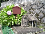 {右}弘法のいぼとり水 須雲川橋を渡り右カーブに入る手前のガードレールの外側にある。大きな岩の上に弘法大師と刻まれた石碑があり岩には穴があって水が溜まっておりその水をつけるとイボが取れると言われる。岩は箱根火山の安山岩で保水性が高いため水は涸れないと言われ須雲川橋が新しく架けかえられる前は現在の橋の下にあって橋の工事で移転した。須雲川橋は幕末に板橋から土橋に変わり長さ6間(11m)幅2間半(4.5m)だった。橋を渡り女転し坂がないので迂回して県道を登っていくと途中右に箱根大天狗神社があり左の女転し坂の説明板を過ぎさらに進むと左に東京電力畑塾発電所があり発電所前バス停がある。 |