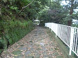 割石坂石畳(須雲川自然探勝歩道) 割石坂に入りすぐ石畳が始まり杉林の山道となる。少し平坦になると江戸時代の石畳の標示が最初と終わりにあり短い距離ずつだが江戸時代の石畳が2区間ある。他の部分は小学校の通学路として明治以降に整備したもの。途中には探勝歩道の説明板があり石畳の解説が書いてある。細道と交差する地点に箱根路の変遷を示す解説板があり少し先の小さい橋で東京電力畑宿発電所の導水管を渡る。探勝歩道の案内図を過ぎると県道に合流する。 |