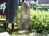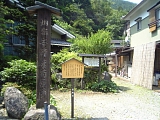 {右}茶屋本陣 茗荷屋跡 畑宿内の県道を進むとある。茗荷屋畑右衛門の茶屋本陣跡で山間の水を引いた滝と沢山の鯉がいる池を持つ庭園が評判だった。安政4年(1857)江戸入りの途中に箱根関所で起きたトラブルで機嫌が悪かった米国初代総領事ハリス・タウゼントが休息し庭園を見たら機嫌が良くなった。建物は大正元年(1912)の全村火災で焼失したが庭園は残っており園内には大名に出した米を挽いた風車用石臼や稲荷社がある。山崎の戦いで敗走してきた伊庭八郎はここで切られた片腕の応急処置をした。明治元年(1868)東京遷都時と京都還幸時、翌年東京再幸時に明治天皇も休息し敷地少し先に明治天皇御駐蹄之趾の石碑がある。 |