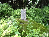 {左}大澤坂標石 県道を200mほど進むと左に箱根旧街道の鉄柱がありガードレールの隙間から石段を降り下り坂の獣道に入り下りきると小さな沢(大沢川)を渡る。橋は現在は木橋だが江戸時代は土橋で寛政10年(1798)小田原藩の手で長さ幅とも2間(3.6m)の石橋に変わり千鳥橋と言った。橋を渡り登り坂となりしばらくすると大澤坂の石標と説明板がある。登り2町(218m)余りの大澤坂は幕末の下田奉行小笠原長保の甲申旅日記に「大沢坂又は坐頭転ばしともいうとぞ このあたりつつじ盛んにて趣殊によし」とある。地面を掘り下げ小石と土をつき固めた上に平らな石を並べ横に側溝(排水路)がある江戸時代の石畳が一番良く残っており構造の解説板も崩れているが置かれている。坂を進むと左右に新旧混在の墓地がある。 |