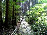 {右}西海子坂(さいかちざか)標石 一里塚を過ぎると薄暗い森の中へ入る。江戸時代の石畳も残り排水溝の解説板がある。やがて県道に出る石段の手前に登り2町(218m)余りの西海子坂の標石と説明板がある。西海子とは馬の薬になる刺の多い樹木で坂は「山中第一の嶮にして壁立するが如く 岩角をよじて上る。一歩を誤れば千仞の谷底に落つ」と言われ天明6年(1786)には早飛脚が落馬して死んでいる。東海道名所日記には「あまたの人 みな馬よりおりて 歩にてゆくもの 術ながりてあせをながし とち涙をこぼすもの多し」とある。しかし現在は最も急な部分は震災で崩壊したため歩けず県道に出て迂回することになる。他に橿木坂、猿滑坂など東坂きっての急だった部分も全て震災で崩壊している。 |