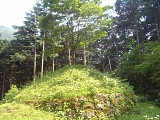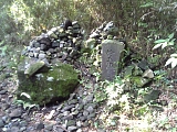 畑宿一里塚(23) 分岐からすぐに円形の塚が石畳道の両側にある。塚は左側が戦争時に畑として切り開かれかなり崩れていたが平成10年箱根町が発掘調査し昔のままの形に復元した。山の斜面にあるため周囲を盛土、切土と石貼で平坦面を作り幕府の命令通り直径5間(9m)の円型で裾廻りを石垣で固め中に礫を積み上げ表層に高さ1丈5尺(4.5m)に土を盛っている。木は右が樅(モミ)左は欅(ケヤキ)になっている。右の塚を過ぎた所に昭和46年建立の石碑がある。 |