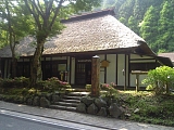 {右}箱根旧街道資料館 畑宿395 しばらく県道を進むとある。昭和47年開館の古い農家を移築した茅葺き屋根の建物で中は無料休憩所と展示室がある。展示室には江戸時代の庶民の旅をテーマに旅道具や男の旅、女の旅など資料が展示されている。この付近は赤穂浪士の一人の神崎与五郎が江戸に向かう途中に馬子にいいがかりをつけられ詫証文を書いて穏便に済ませたと講談、戯曲の舞台になっているが実際は三島宿での話で書いたのは大高源吾で馬子の名は国蔵だった。三島宿の世古本陣に残されていた証文の移しと茶屋での源吾と国蔵の様子が人形で展示され外には馬つなぎ用の木が再現されている。9:00-17:00(12月〜2月は-16:30)年末年始休、展示室70円。 |