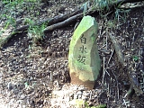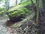 {右}割石坂標石 発電所前で須雲川橋手前で分岐した須雲川自然探勝歩道が県道に合流し探勝歩道はここから旧東海道と同じ道をたどる。すぐ先に坂の標石と説明板、探勝歩道看板(畑宿1000m奥湯本4000m)があり県道から右に分岐し石段を登る。坂は登り1町(109m)余りのゆるい坂で曽我五郎が富士の裾野に仇討ちに向かうとき刀の切れ味を試そうと路傍の巨石を切りつけると真二つに割れ片方は谷底に転落したという伝説が由来となっている。 |