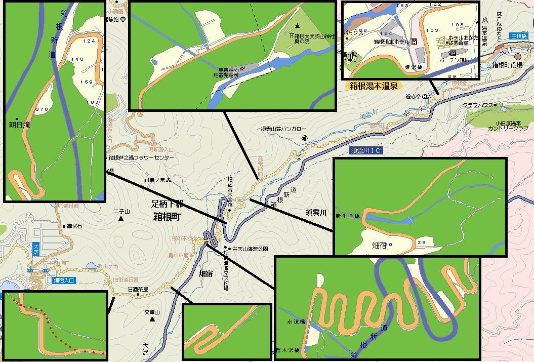 箱根旧街道 三枚橋を渡ると箱根旧街道となる。江戸幕府は元和4年(1618)旧来の湯本から湯坂山、浅間山、鷹ノ巣山、芦ノ湯を経て元箱根に至る湯坂道(近古道)を廃し三枚橋から須雲川に沿い畑宿を通り二子山の南側を経て元箱根に至る古い山路をひろげ新しい東海道とした。寛永12年(1635)参勤交代が始まると一層交通が盛んとなり小田原宿から三島宿の間が8里だったので箱根八里と呼ばれここからの上り坂を箱根東坂、箱根峠から三島宿に至る下り坂を箱根西坂と言う。石畳を中心に昭和35年東坂の一部が国史跡指定、平成16年に西坂の一部も追加され箱根旧街道の4分の1が国指定史跡になっている。箱根越えは他にも碓氷道(上古道)、足柄道(中古道)、新道(国道1号)、箱根新道がある。 |