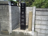 {右}松長一里塚跡(30) しばらくすると民家の塀の間にある。平成16年8月建立の新しい黒石碑で「松長一里塚跡碑」と刻まれている。大諏訪と松長の境にあったので大諏訪一里塚とも呼ばれ大諏訪側には3軒の茶屋が並んでいた。碑の横には「火之要心 西 松長 東 大諏訪」と刻まれた石柱もある。 |