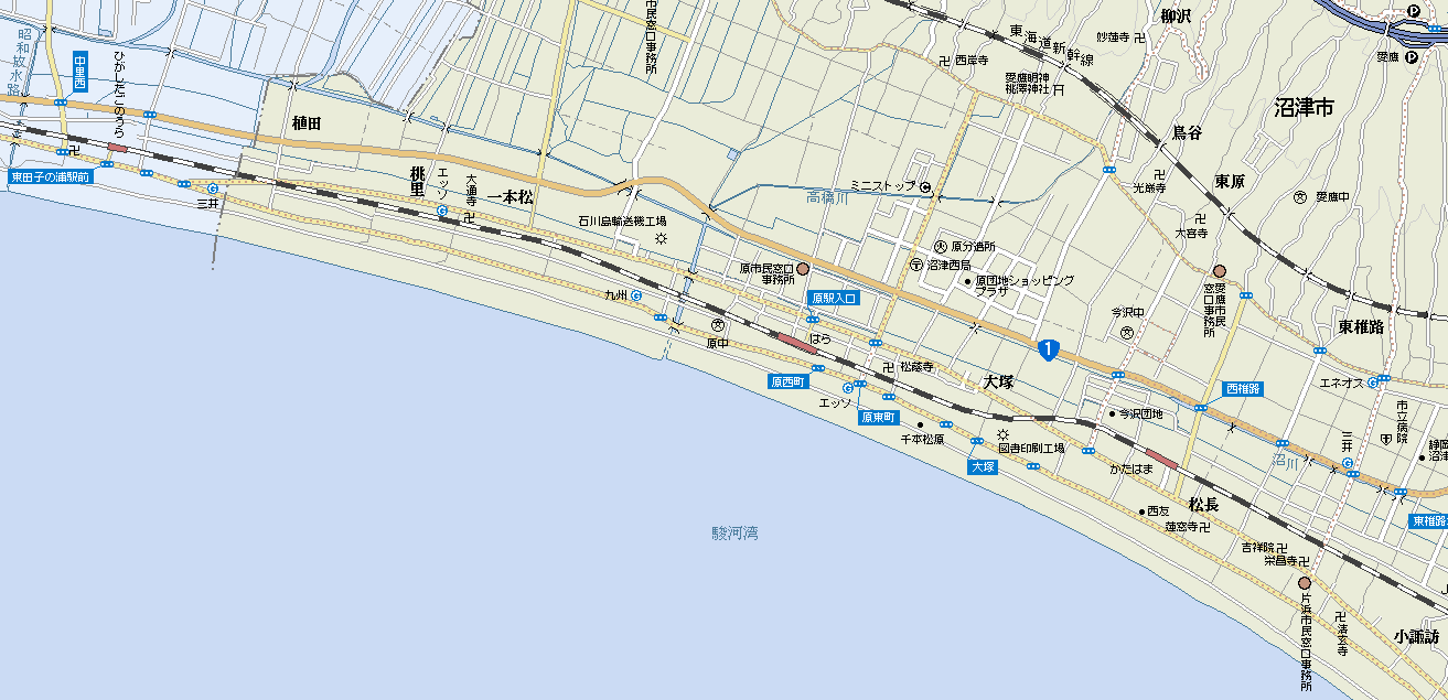 新田大橋 しばらく行くと185間(300m)の宿外の集落である六軒町で手前には西木戸があり原宿開設当初は家が6軒だったので名付いたという。六軒町の次は原新田で民家はなく松並木があった場所で左の永田自動車商会を過ぎると道幅が広がっているのは松並木の名残。まもなく昭和30年に完成した沼川第二放水路を昭和39年竣工の新田大橋で渡る。橋の左に平行して設置された水道管上には小便小僧がある。沼川は東海道とほぼ並行に流れている川で富士の田子の浦で駿河湾に流入している全長14.1kmの一級河川で海から逆流する海水により何度も新田に甚大な被害を与えていた。 |