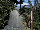 {左}鶴芝の碑 少し行くと民家の前に碑と説明板がある。高さ2m程の碑は鶴の茶屋と呼ばれる茶屋に文政3年(1820)建てられたもので正面に京都の画家蘆洲が描いた一羽の鶴が線刻され上に江戸の学者亀田鵬斎の詩文がある。当時ここから見る富士山は中腹の芝生のように見えるところに鶴が舞い亀が遊ぶように見える絶景で鶴芝・亀芝と呼ばれた。隣には富士市の標柱もあり当時の間宿本市場の絵地図が書かれている。江戸から来た旅人はこの辺りを過ぎると富士山は振り返って見る事になる。 |