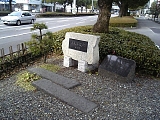 {右}東海道跡の碑 駐車場を通過すると富士市役所前を通る青葉通りに出る。東海道が横切っている箇所の緑地帯に御影石の碑(高70cm幅104cm厚27cm)と説明碑、小さな松がある。昭和41年富士、吉原、鷹岡の二市一町が合併して現富士市となりこの周辺が中心市街地として依田原新田区画整理事業により整備された際に旧東海道はこの地で分断されたため平成13年東海道400年祭時に跡地として整備された。碑の前には近年南方350mの青島町より発掘された旧東海道の石橋の細長い石2つが砂利に表面だけ出し埋められている。青葉通りの先に道は続いているが渡れないので左の錦町交差点を迂回する。交差点脇に木製の説明板、渡った所には富士市の標柱がある。 |