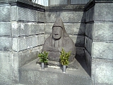 {右}袂の塞神 (たもとのさえのかみ) 橋を渡ると川原宿といわれる地域になり小さな川が左に現れる所に明治40年(1907)の洪水で流された建物の跡を示す題目碑「御宝灯流失之碑」と石の角柱がある。しばらく行くと笏を持ち頭巾を被った僧行形道祖神(高さ88cm幅70cm)があり袂の塞神と呼ばれている。塞神とは集落の守るため入口に祀られた道祖神で蓼原と塔の木の集落の境にあるため蓼原単体道祖神とも呼ばれる。年号は不明だが江戸後期の作と推定されている。旧吉原地域では全部で188基の道祖神がありそのうち単体道祖神は86基ある。僧行の単体道祖神は殆どが伊豆方面に集中しているため伊豆型道祖神と呼ばれている。 |