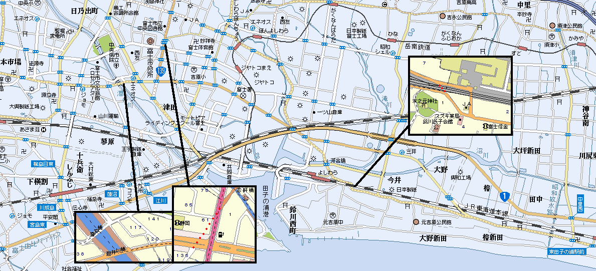 河合橋 吉原駅北口交差点を過ぎしばらく進むと沼川に架かる河合橋を渡る。江戸以前の東海道は吉原湊から富士川まで渡船だったため江戸初期に初めて架けられた。手前左に天明3年(1783)の馬頭観音がある。橋を渡ると東海道は東海道線から次第に離れ大昭和紙工産業(依田橋61-1)に沿って二叉路を左に進むと途中に松が1本と旧東海道標示、富士市の標柱(地図付)がある。やがて吉原駅入口交差点で国道139号線に合流し150mほど先の国道1号バイパスと東海道新幹線の高架をくぐる前のホンダプリモ富士(依田橋770-1)の横で右に分岐し県道171号線に入る。高架をくぐり小野田石材を左に見て進むと道は右にカーブしていく。 |