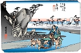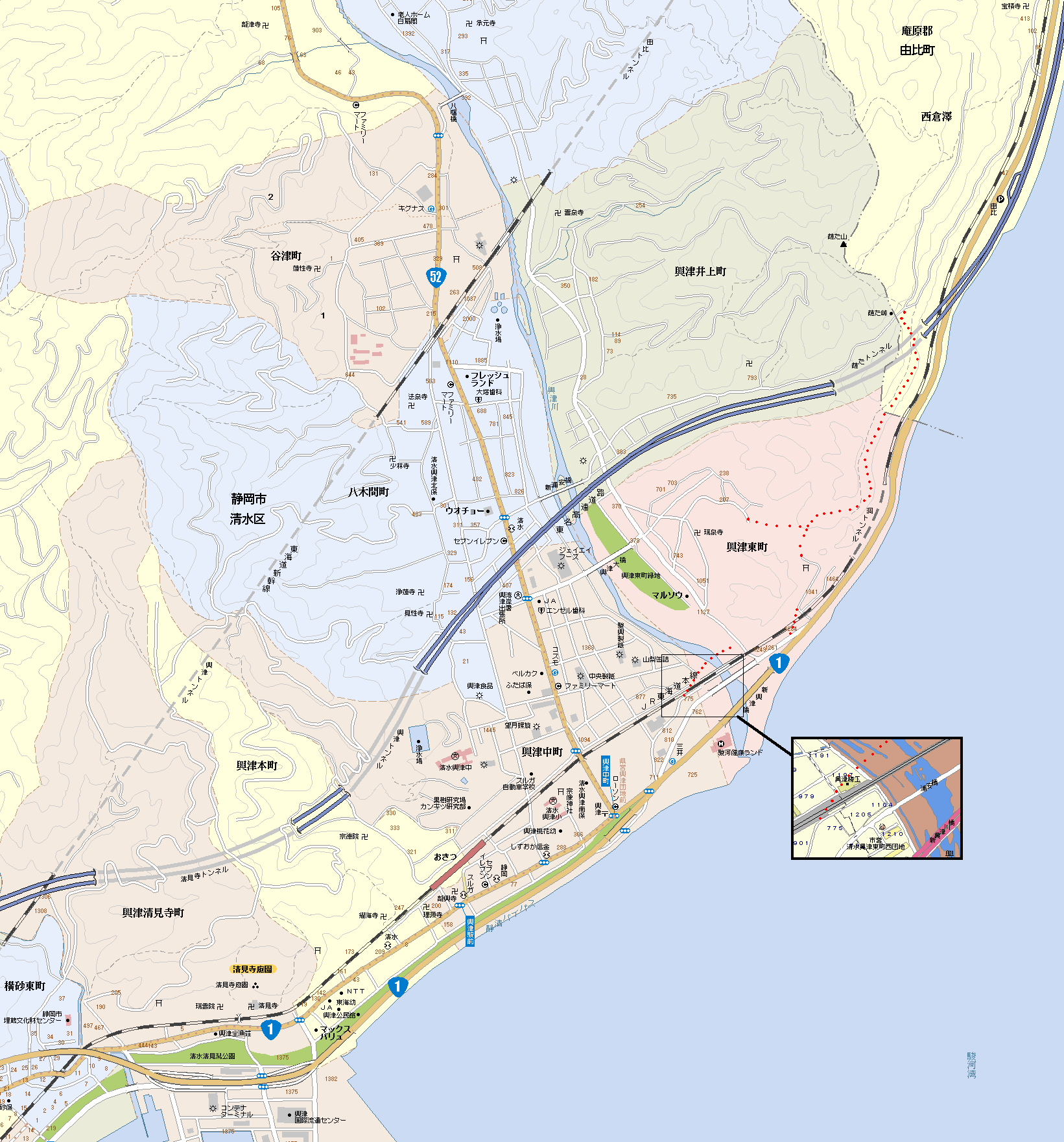 興津宿 本陣2脇本陣2旅籠34家数316人口1668[天保14年(1843)] 東は興津川と薩埵峠、西は清見寺山が駿河湾に迫る難所に位置することから古代より関所(清見関)が設けられていた。興津郷と呼ばれる頃から地頭・長者だった興津氏が延文年間(1356-61)横山城(興津城)を築き永禄11年(1568)まで支配していた。身延、甲府へ通じる身延道が分岐するため交通の要衝にもなり江戸時代中〜後期には興津川流域で生産される和紙の集散地となった。明治以降は明治の元勲の別荘が建ち避寒地になった。東の由比宿には2里12町(9.2km)西の江尻宿には1里2町(4.2km)宿内は東西10町55間(1.2km)。 |