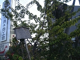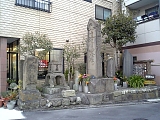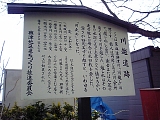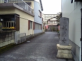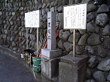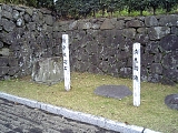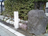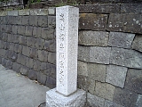 {右}高山樗牛(ちょぎゅう)仮住居跡 少し行くと石垣前に昭和44年建立の石柱「高山樗牛假寓居之處」がある。明治時代の文豪である樗牛は清見潟の風景をこよなく愛し明治33年(1900)ここから20mほど南にあった三清館に仮住まいし病気療養した。そこで樗牛は清見寺の鐘の音を聞き名文「清見寺の鐘声」を残したという。清見寺鐘楼前に尾上柴舟の筆による「清見寺の鐘声」の一節が刻まれた碑がある。樗牛は2年後の明治35年平塚の杏雲堂病院で31歳で死去したが墓は遺言により清見潟を見渡す観富山龍華寺(清水区村松2085)に建てられた。石柱の後ろには明治20年(1887)の屋根付きの小さな高札場がある。 |