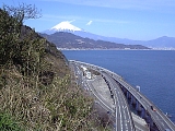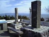 {右}薩埵峠 展望台 遊歩道を進んでいくと木造の簡単な展望台があり振り返るとパンフレットや旅行雑誌等で目にする有名な富士山の眺めが見れる。すぐ先左には「山の神」と刻まれた平成12年建立の黒石柱もある。しばらくすると右に薩埵峠の写真入りの石碑(夢舞台道標の特別バージョン)と四阿がある。万葉歌人山部赤人の有名な歌「田子の浦ゆ うち出てみれば 真白にぞ 富士の高嶺に 雪は降りけり」はこの付近から詠まれたとも伝わる。他にも万葉集では薩埵峠は岩城山(磐城山)とも呼ばれ「岩城山 ただ越し来ませ 磯崎の 不来海(こぬみ)の浜に われ立ち待たむ」もある。 |