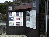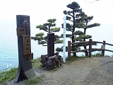 {左}薩埵峠の碑 オブジェのすぐ先に夢舞台道標清水市 薩埵峠、薩埵峠の黒石碑、「清水市指定名勝 薩埵峠」の平成元年設置の白い柱があり斜面に松が3本ほどある。右には峠の歴史と薩埵山の合戦の2枚の説明板がある。薩埵山はたびたび古戦場となっており正平6年/観応2年(1351)弟直義を追討する足利尊氏、永禄11年(1568)武田信玄を迎え討つ今川氏真、その翌年武田配下の穴山梅雪が守る横山城と対陣した今川救援の北条氏康が薩埵山に布陣した。興津川の対岸に古戦場跡碑がある。道はこのあと下りになりすぐに二叉路になるが右の上りの道はすぐ先で行き止まりのため左の道を下っていく。道は階段となり急激に下ると木に囲まれて暗いくぼみのような山道となりそれを抜けると墓地の脇道となる。 |