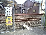 (左の道)踏切のない線路 寺を出ると道はしばらくして右にカーブしまっすぐ行くと踏切のない東海道線の線路に出る。危険なため迂回を促す看板もあり少し手前の道を左折すれば洞踏切があり迂回もできる。旧道は国道1号から興津川橋へ行く道が分岐する地点に出るので右折して興津川橋へ行く道を進み橋の手前で右から来る(右の道)と合流する。合流地点には平成2年設置の文字がかすれた「薩埵峠街道の歴史」の説明板があり瑞泉寺経由(右の道)は上道、海岸寺経由(左の道)は中道、安政元年以降の東海道は下道になっている。 |