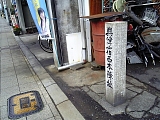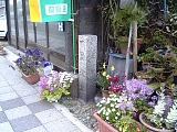 {右}興津宿西本陣址 その先の山梨自転車商会手前に石柱がある。西本陣は手塚家がつとめ寛永12年(1635)から明治3年(1870)まで東本陣の市川家と月番で営んでいた。明治元年(1867)には明治天皇が小休した。その後、敷地は人手に渡り建物は残っていないが門だけは一時水口屋の敷地内に移され現在は元県知事(1951-1967)斎藤寿夫邸(富士市)に移され現存している。手前右のたばこ屋のあたりに脇本陣の落合家、向かいの市川製作所あたりに脇本陣大黒屋、少し先の左に脇本陣身延屋があった。 |
