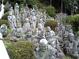 {右}清見寺 五百羅漢像 境内左奥に進むと小山の斜面に天明8年(1788)作者不詳の五百羅漢があり島崎藤村の小説「桜の実の熟する時」ではこの五百羅漢像の中に知人の面影を見つける場面がある。入口右には後生車もある。手前にある聖観世音金銅像は昭和10年(1935)新西国観音霊場第1番指定記念と日華事変戦死者供養の為に昭和12年20代住持古川大航が東京美術学校教授北村西望に作成依頼して建立したが戦争供出し昭和24年に再建。他に境内左に大正4年(1915)東京の実業家町田徳之助が建立した納骨堂の海會塔、安永5年(1776)庵原の素封家山梨惟亮が父治重のために建立した五重石塔があり白隠禅師による治重の賛辞も刻まれている。石段を登ると足利尊氏が国ごとに建てた利生塔の旧址がある。 |