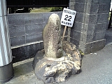 {左}河童のこしかけ石 橋を渡ったところに石と平成4年建立の説明碑ある。平成3年台風の修復作業の時に発掘された石で河童橋に因んで河童のこしかけ石と呼ばれる。慶長12年(1607)家康が駿府城の大改修をする際に伊豆から運んでいて巴川に落ちたと推定される石で同様の石が慈雲寺や巴川製紙所清水事業所(入江1-3-6)にもある。河童の伝説は藁束に複数の武者の顔を付けた清水の郷土人形「いちろんさんのでっころぼう」にも影響している。橋を渡った右には平成2年設置の船高札の説明板もある。正徳元年(1711)から明治の初めまで船に関する定めを掲示していた高札場がここにあった。 |
