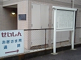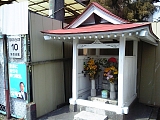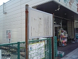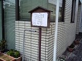 {右}秋葉道入口 商店街を進み広い道路を渡るとコーティングした紙を貼った木製立札がある。秋葉山栄松院(西久保1-2-28)に通じる参道が古くから秋葉道と呼ばれており入口には戦後まで「秋葉山五丁入」と刻まれた石道標があった。現在はレンガ敷きの道になっている。この道は「矢倉の辻」で北街道(中世の東海道)にも接続し辻村の主要な道路でもあった。 |