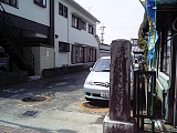 {左}都田の吉兵衛供養塔 少し先の民家の塀前にある。旅籠青木屋の跡で文久元年(1861)泊まっていた都田(現:浜松市都田)の吉兵衛(通称都鳥)が押し入った次郎長一家により討ち取られた。次郎長の子分森の石松が四国の金刀比羅宮参りの帰路に遠州笠井の寺島の常吉を訪れた際に持っていた香典25両を狙った都鳥は石松を騙し殺したと講談などで語られている。しかし実際は殺したのは保下田の久六の残党の布橋の兼吉で都鳥は兼吉に頼まれ次郎長に侘びを入れに行く途中だったと言われ長い間悪者とされ供養塔がないのを憐れんだ追分羊かん本店14代目府川松太郎が昭和38年に供養碑を建立した。 |