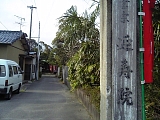 {右}江尻宿 東木戸跡 その先の十字路を渡った居酒屋碓水(本郷町8-18)の前にに木製立札がある。辻村と本郷の境に江尻宿の東木戸(見附)があった。この付近は道路が枡形までにはなっていないが「く」の字形に曲がっており外から宿内を見通すことが出来ないようになっている。木戸の脇には番小屋もあったとされる。東木戸から本郷町、鍛冶町、鋳物師町、伝馬町、中心の宿通りである下町(志茂町)、中町(仲町)、上町(魚町)、巴川を渡って入江町の西木戸までおよそ2kmであった。 |