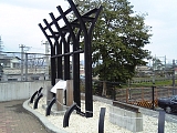 {右}旧上原跨線橋のモニュメント 狐ヶ崎駅を少し過ぎたところで静岡鉄道の線路を跨ぐ道路との交差点にある。線路を跨ぐための橋は平成16年に新しい橋がかけられたため旧橋の部材がモニュメントととして設置された。昭和2年(1927)竣工の旧橋(長さ22.5m幅4.2m)は鉄道のレールを部材に使用した橋で太鼓橋と呼ばれていた。右にある鉄道レールには「DICK. KEER. SANDBERG. D. K. 1911」とメーカー名や年号が刻印されておりドイツのドイチェカイザー社で明治44年(1911)に製造され橋桁として使用されていた。旧橋は幅員が狭く一方通行などの規制があったため新しい橋は幅が旧橋の2倍以上(8.5m)で2mの片側歩道がある。 |