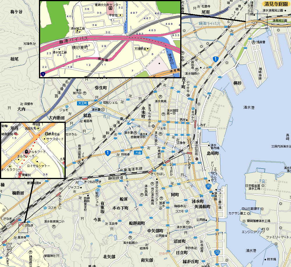江尻宿 本陣2脇本陣3旅籠50家数1340人口6498[天保14年(1843)] 川の尻(下流)の語源が示す通り巴川の砂州に出来た宿で元は現在より北(北街道沿い)にあって今川氏の頃から市場として栄え永禄12年(1569)江尻城築城以降は城下町として栄えた。江戸時代に入り家康は銀座通りを通る道を東海道とし現在の辺りを江尻宿とした。宿場の南にある清水湊は物資輸送、軍事の要衝で江戸と大坂を結ぶ拠点として栄えた。幕末以降最大の生産物である茶は横浜まで運び輸出していたが明治32年(1899)清水港も開港場として認められると茶の輸出量の8割のほか鮪や蜜柑の缶詰の輸出、木材の輸入も直接行った。大正13年(1924)清水市、平成15年静岡市になった。 |