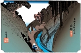 岡部宿 本陣2脇本陣2旅籠27家数487人口2322[天保14年(1843)] 文治元年(1185)にはあったという古い宿で頼朝の家臣岡部小次郎泰綱が開いたと言われる。江戸時代の宿場としては他より1年遅れて慶長7年(1602)指定された。小さな宿場のため旅籠も少なく大名の宿泊時には夜具も隣宿から借りるほどだったが往来する人々を相手にした茶屋・駕籠屋などは多かった。名物は豆腐とシダ細工。豆腐は鎌倉時代からの名物で東海道膝栗毛にも「豆腐なる おかべの宿につきてけり 足にできたる 豆をつぶして」と詠まれている。シダ細工は花籠や盆などで明治には海外にも輸出された。現在は大規模の交通から離れている為に静かな町並みとなっている。 |