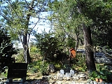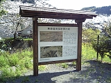 {右・寄}笠懸松・西住墓 分岐点には笠懸松の説明板もあり旧道に入りすぐ右の標示を右折していくと右に登り口と案内板、ベンチがある。登り口には竹杖が置いてあり階段を登っていくと頂上に松が植えられ根元に西住墓と伝えられる古い石塔、平成11年建立の句碑、ベンチ、花壇、付近の案内板などがある。小さいものも含め3本ある松は2代目で初代は昭和49年頃に枯れ切株が残っている。旅の途中の天竜川で乱暴者を懲らしめた弟子の西住を西行は僧にあるまじき行為として破門し形見として笠と筆跡を渡したが西住は密かに西行を追い保延3年(1137)岡部で病に倒れ形見の笠に辞世の句を書き残し没した。後年この地にあった堂に立ち寄った西行が戸に掛けられた笠を見て西住の死を知り追悼の句を詠んだ。 |