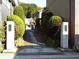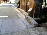 {右}枡形跡 少し行くと左から道が合流する場所の向かいに説明プレート石柱がある。岡部宿江戸側の枡形は道路を整備する際に真っ直ぐに改修され現在は跡形もない。説明プレートには東海道分間延絵図の当該地部分も転写されている。ここから岡部宿でしばらく先右には古い常夜燈と祠がある。さらに進むと道は左へカーブしていくが旧東海道は右(直進)の細道へ分岐する。分岐点には旧東海道の方向表示もある。 |