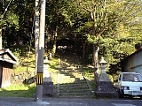 {右}須賀神社 水守17 少し先に大きな楠が目立つ神社がある。本殿は江戸後期の築で一間社流造の柿葺。大楠は県指定天然記念物の御神木で指定時の昭和33年当時で樹高23.7m目通10.9m根廻り15.2m枝張東西21.2m南北27.9m。木の手前には秋葉神社の祠がある。境内には他に左に大正12年(1923)建立の陸軍大将川村景明揮毫の忠魂碑、昭和30年県知事斎藤寿夫揮毫の盡忠之碑がある。灯籠は右に昭和3年(1928)、左に天保6年(1835)。 |